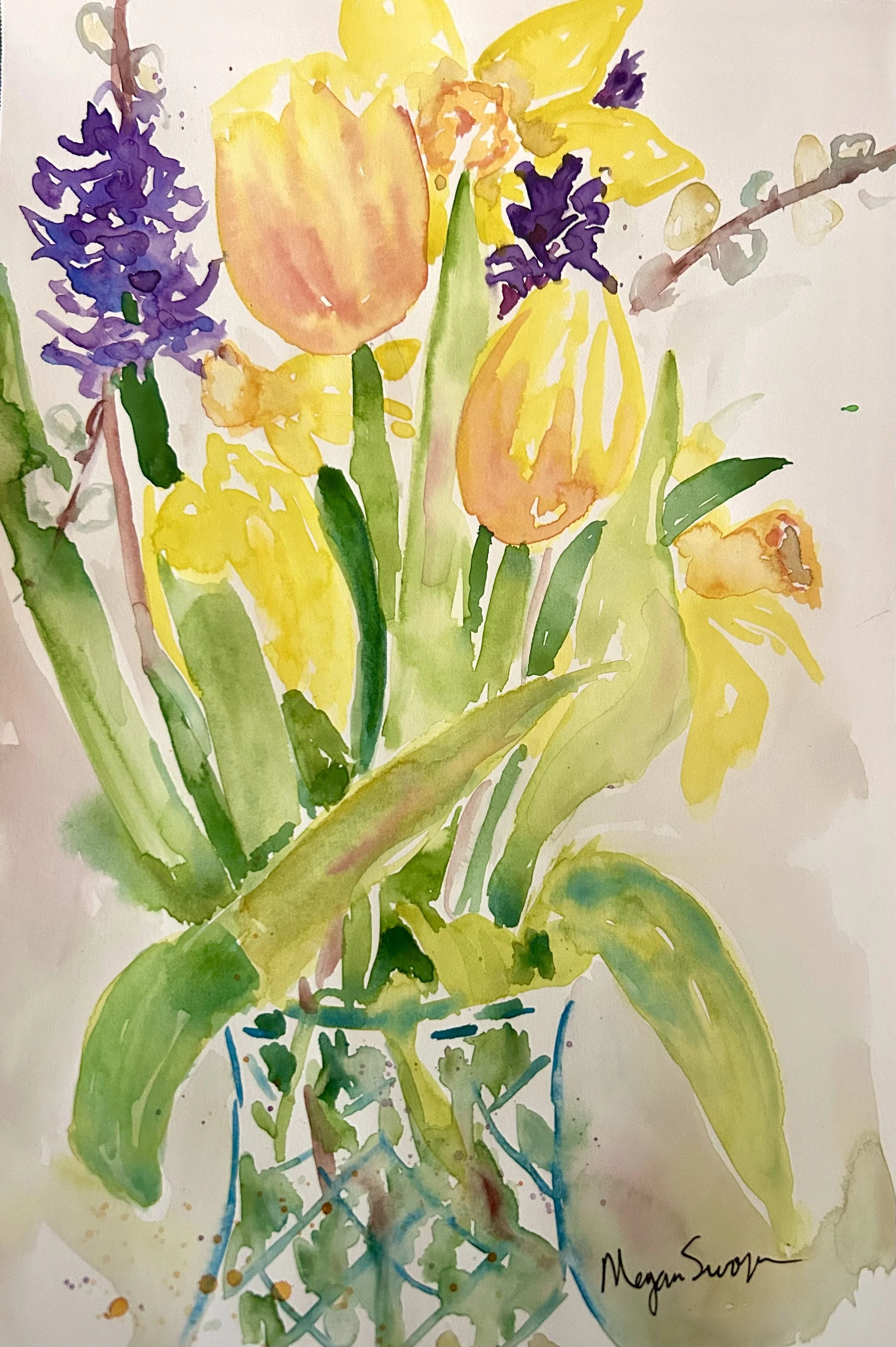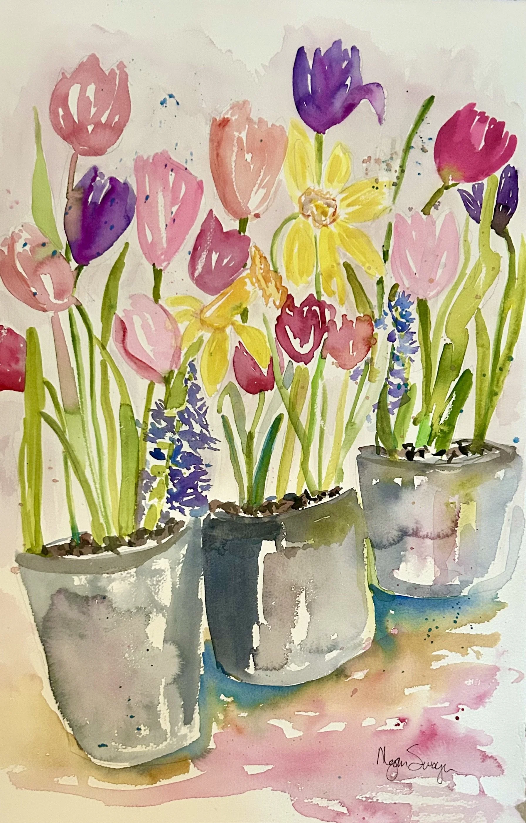 Another trip to the market and the stands were popping with all kinds of spring plants. I love the tiny daffs in these pots. So elegant as they merge with the other spring bulb plants! Painterly pots add to the vignette! This painting sells for $60 and is 9” x 12”. If you’re interested in purchasing this painting, click here or contact me at the Contact Me page on this site.