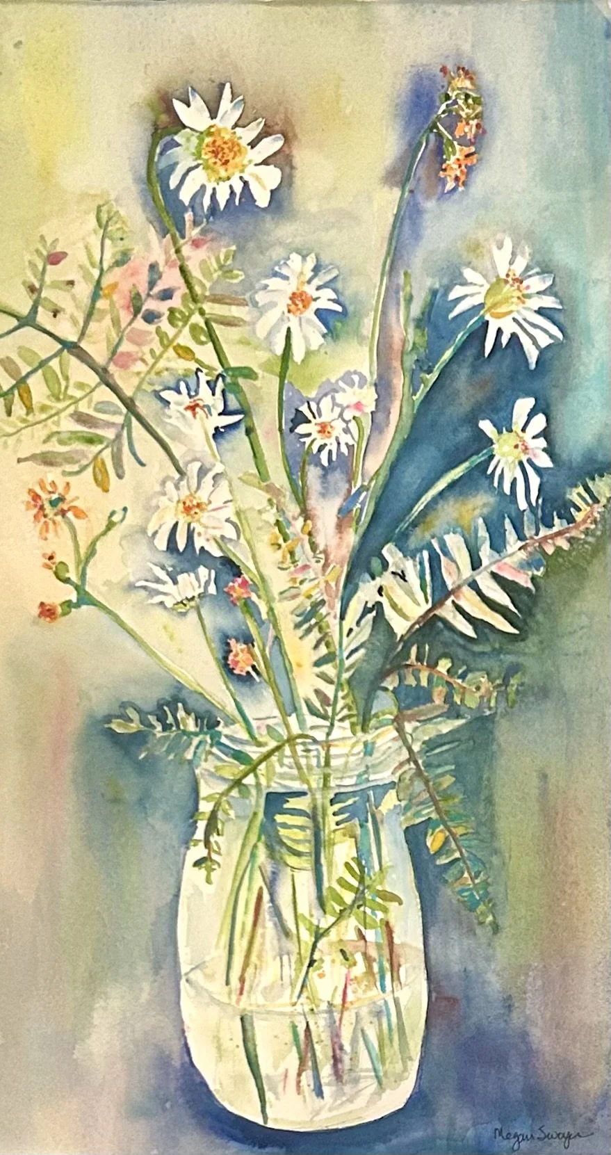 Whatever was growing and blooming near me at the time makes up the ingredients (subject) for this painting. Put them in an old jar and add a unique and moody background and you get quite a recipe! This painting sells for $90 and is 12” x 22”. If you’re interested in purchasing this painting, click here or contact me at the Contact Me page on this site.