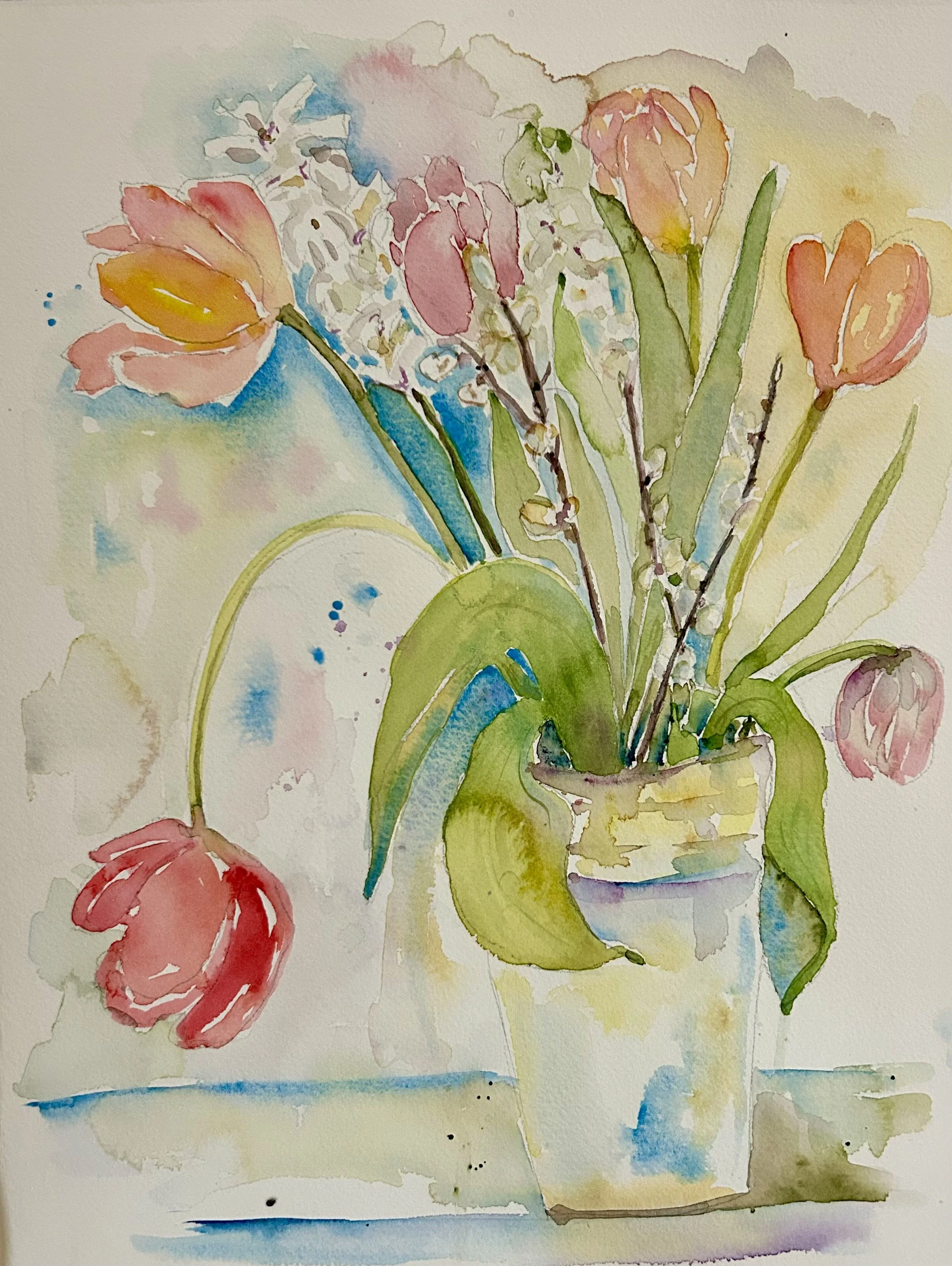 This 9” x 12” painting features purple bellflowers and lots of tulips. It was inspired by a trip to the market in February. A sight for sore eyes, to be sure! This painting sells for $72. If you’re interested in purchasing this painting, click here or contact me at the Contact Me page on this site.
