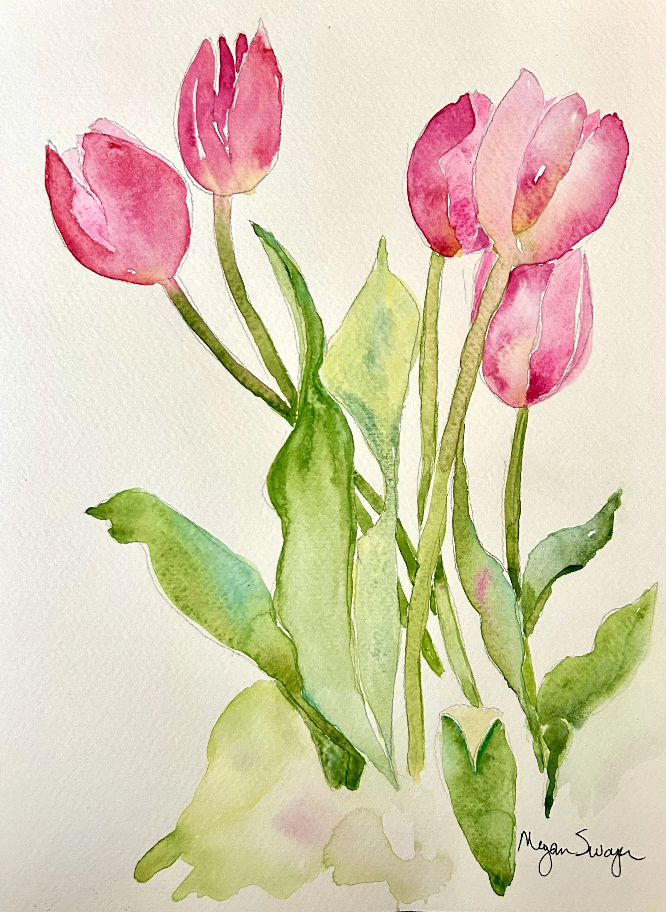 Luscious pink tulips and their fascinating, curvy leaves caught my eye for this study. I love the subtle background with just a bit of a wash in the lower part. The bright flowers stand alone and pop against the white paper. This painting sells for $64 and is 9” x 12”. If you’re interested in purchasing this painting, click here or contact me at the Contact Me page on this site.