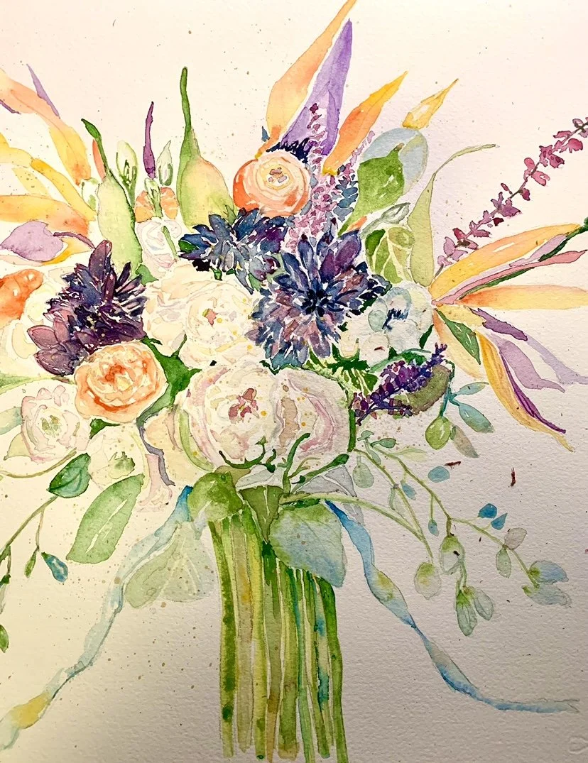 This Bride’s Bouquet was commissioned by a bride’s mother. it was so much fun to paint as I was at the wedding and know the bride, so could relive the day as I painted it from a really nice photograph! I love spritzes of purply-pink flowers mixing in with the classic roses! It was a festive day, to be sure, and splashes of the faintest pinks reflect the bride and her dress. The blue backdrop picks up on my groom’s beautiful suit. Click here to contact me about painting your bouquet!